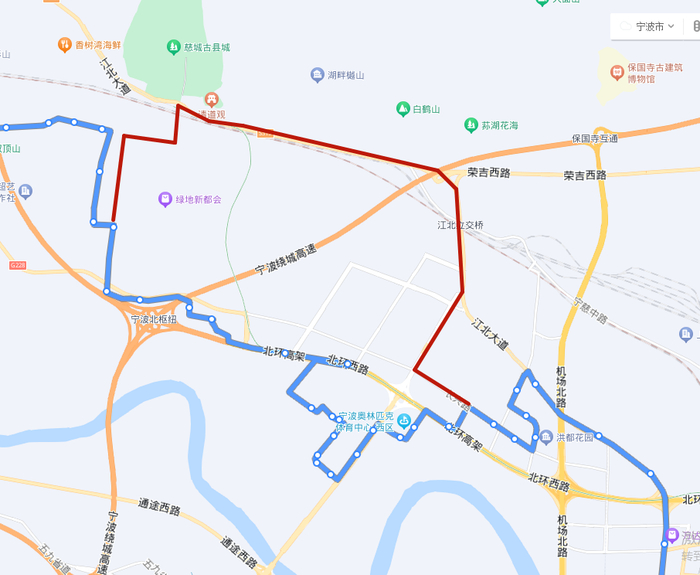 1.调整走向:江北连接线慈浦路口后改走慈浦路、慈江西街、保黎南路、宁慈西路、江北大道、广元路、广元路长兴路口后恢复原线运营。