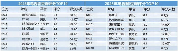 在2023年国剧豆瓣评分TOP10(共16部)中,鹅厂就是让人望尘莫及的存在了,不仅占据7席,《漫长的季节》《三体》更独占状元、榜眼之位,此外,爱奇艺和芒果各占3部,优酷2部,B站1部。