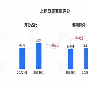 据酷云数据,2022年全端播放量10亿以上剧集27部,2023年这一数据达到了38部之多。另外,今年豆瓣8分剧已有23部之多,远超去年13部总数近一倍,而去年的13部,已经是2019-2022这四年的巅峰成就了。