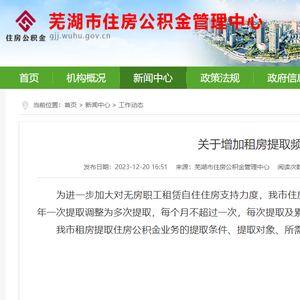 中国质量新闻网讯(李静) 日前,芜湖市住房公积金管理中心公布《关于增加租房提取频次的通知》。