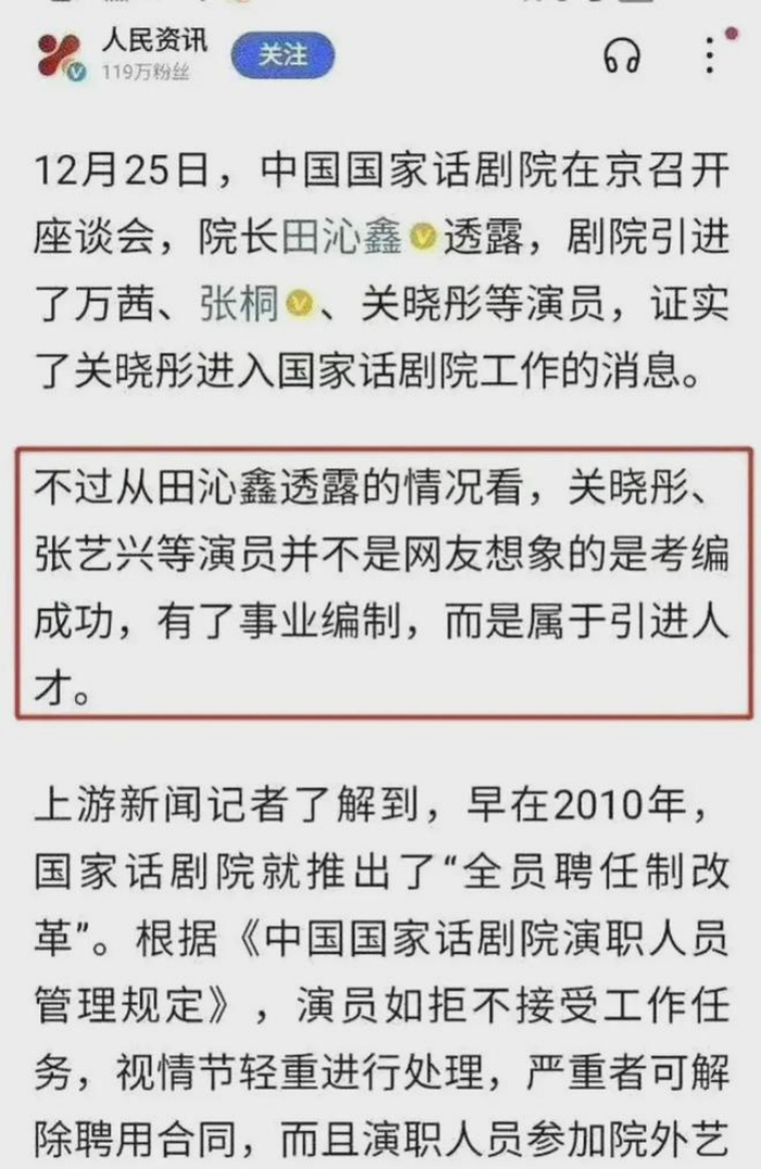 有粉丝澄清,张艺兴的国话演员身份与之前陷入舆论漩涡的考编不同,是合同制,属于人才引进,还经历了三年的考察期。既有的报道也显示,早在2021年,张艺兴就成为了国家话剧院的一名演员。