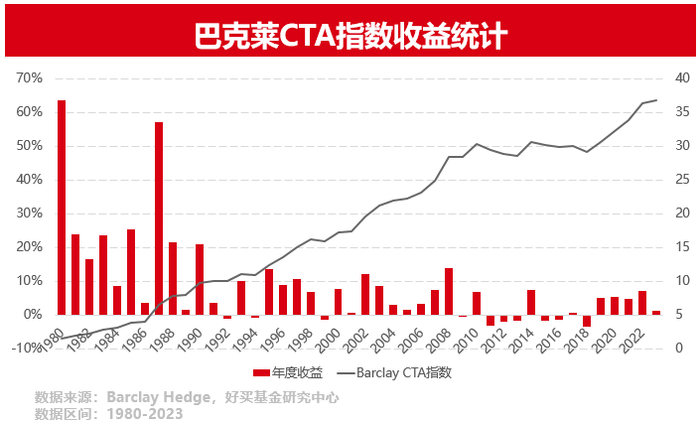 Barclay Hedge编制的CTA基金指数显示,自1980年以来,CTA基金指数累计收益已达3600%。具体来看,在CTA发展初期,CTA基金收益非常优异,1980至1990年的这11年中,CTA基金平均年化收益接近25%,而在1990年后,随着规模的迅速增加,CTA基金收益有所下沉。