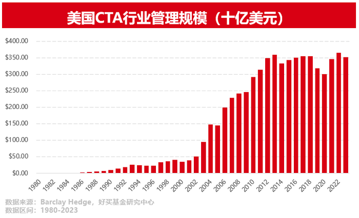 根据Barclay Hedge数据统计,截至2023年第二季度,CTA基金管理规模在3500亿美元左右,而在1980年时,该数字仅为3亿美元。1990年CTA管理规模突破100亿美元,2000年突破350亿美元。CTA基金管理规模自2002年开始至2012年的10年内有非常快速的增长,从500亿美元增长带来3500亿美元左右,之后有所回落。2020年开始CTA规模再次上升。