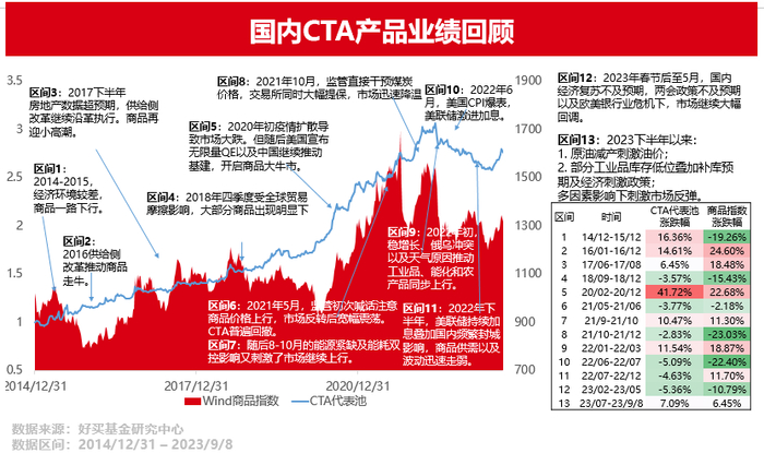 回顾国内量化CTA产品的业绩情况,以好买跟踪的CTA产品来看,我们将2015年以来商品指数的波动划分为13个区间。可以看到无论商品市场牛熊,CTA在多数时期表现平稳。2022年6月美联储激进加息的影响下,CTA出现回撤,2023下半年开始重新向上。