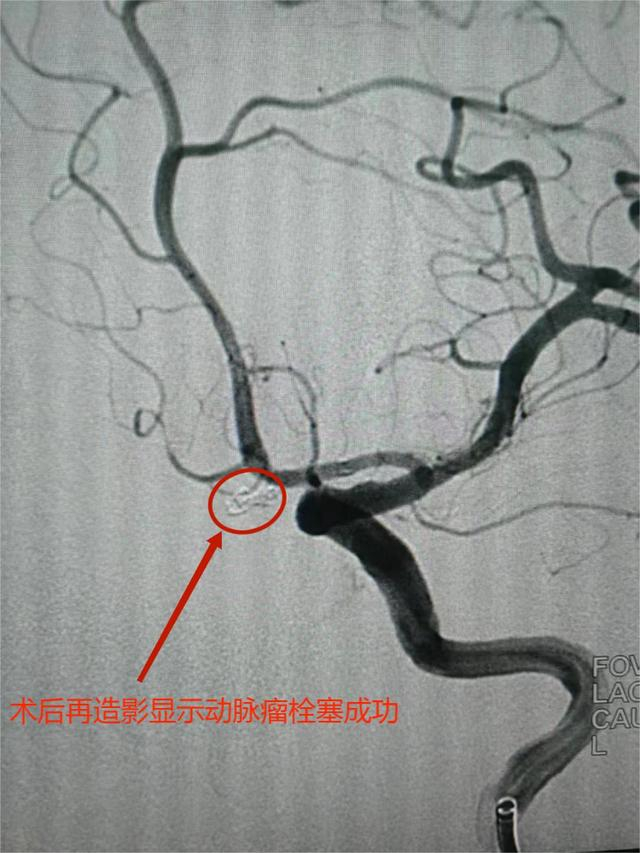 快速完善相关术前准备,并与患者家属沟通后,手术团队为患者实施了前交通动脉瘤微创介入栓塞术(属Ⅳ级手术)。该微创手术创伤小、恢复快,且能解决根源问题。手术很成功,再造影显示动脉瘤栓塞成功,患者术后无任何并发症发生。目前,患者神志清醒、言语清晰、对答切题、四肢活动正常。