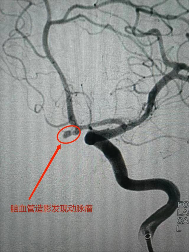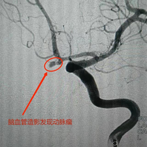 随后,该患者因病情危重被收住重症监护室,经抢救治疗且病情稳定后,完善全脑血管造影,结果提示为前交通动脉瘤,瘤体大小约2.8mm×4mm、瘤颈2mm,形如花生状。