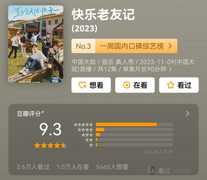 节目频繁的同时,几档节目9.6、9.4、8.0、9.3的豆瓣评分,《快乐老友记》每集过亿的播放量,以及在短视频、社交平台上不少博主的热情安利等,也让再就业男团的团综时至今日,成为了“熟人关系”综艺的第一把交椅。