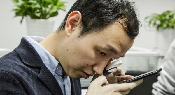 傅高山是北京一家公益组织的负责人,他是一名弱视者,他要戴着厚厚的眼镜,把手机贴在左眼前,才能勉强看得清手机屏幕。
