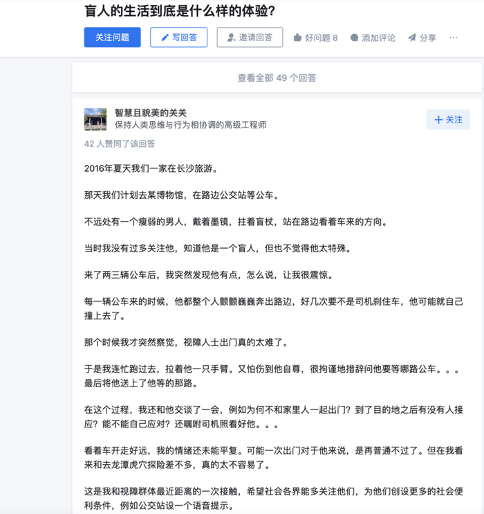 2016年夏天,他们一家去长沙旅游,在路边公交站等公车时,看见一个瘦弱的男人,戴着墨镜,拄着盲杖,站在路边等公交车。让她震惊的是,每一辆公车来的时候,这位盲人都会颤颤巍巍奔向路中间,好几次要不是司机刹车,他可能就撞上去了。这位女性网民连忙跑过去,拉住盲人一只手臂,问他要上哪路公车,并将他送上了车。