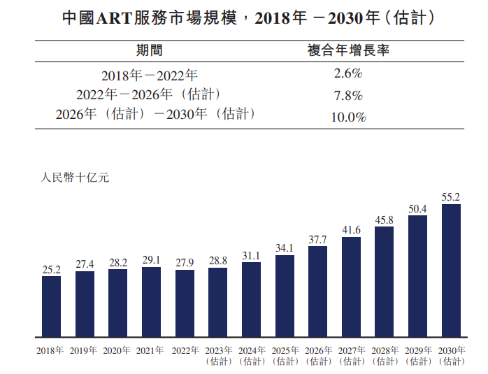 这一行业的发展前景如何?根据弗若斯特沙利文报告,我国的ART服务市场由2018年的人民币252亿元增至2022年的人民币279亿元,复合年增长率为2.6%。