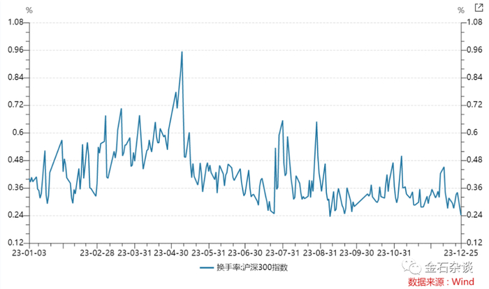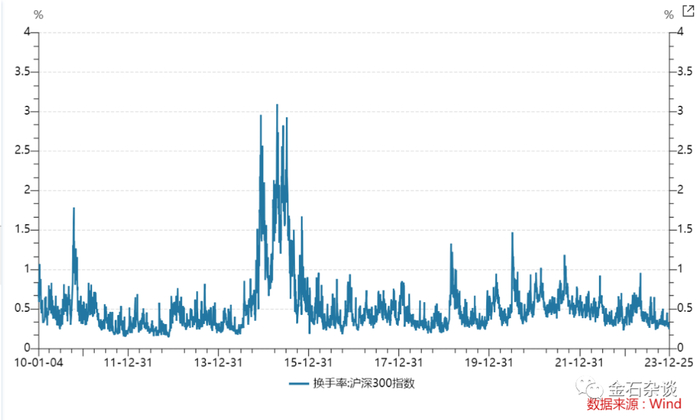 金石杂谈以沪深300为例,从2010年至今,大家能明显看出目前换手率处于历史低位;而从今年的数据也能看出,当前的换手率也处于年内低位,换手率低至0.24,已经处于历史极低水平。很明显现在是“低情绪”。