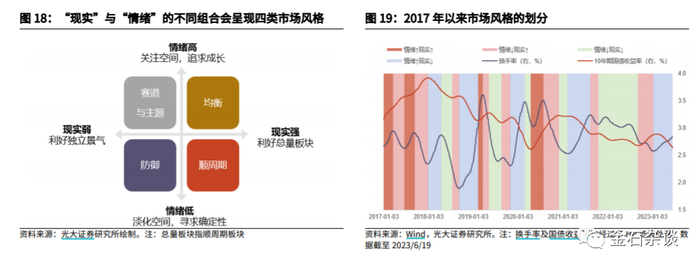 根据光大策略风格时钟,目前市场有两种观点:一是市场情绪正在从情绪低向情绪高迈进,所以AI、chatgpt等赛道主题的机会又来了;二是市场正在从现实弱向现实强迈进,这段时间消费和金融往往表现较好。