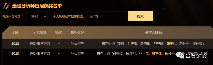 他2014年加入广发证券,2016年加入长江证券,2021年3月加入光大证券,研究范围覆盖A股以及海外市场策略。曾获2020年新浪金麒麟海外新锐分析师第1名,21世纪金牌分析师海外第4名,在2022年和2023年两次斩获最佳分析师团队第四名。