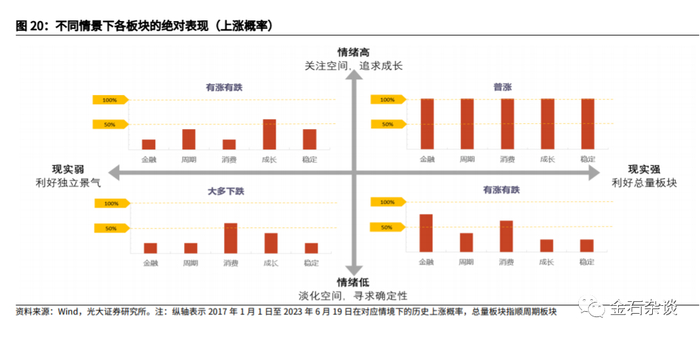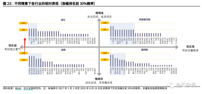 1)“强现实、强情绪”:几乎所有行业都有投资机会,大部分行业均会上涨,风格上较均衡,消费、成长、周期可能都会有不错表现,2017年以来在该情境下排名前2/5的概率均为50%。行业端,电子、国防军工、钢铁等占优概率较高。