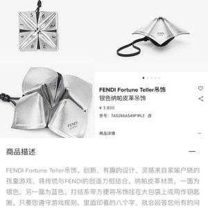 据官方介绍,这款名为FENDI(芬迪)Fortune Teller(算命先生)银色纳帕皮革吊饰,售价3800元。灵感来自家喻户晓的孩童游戏,将传统与FENDI的创造力相结合。一面为银色,另一面为蓝色。打结系带方便将吊饰挂在大包袋上或用作钥匙圈。只要你遵循了游戏规则,里面印着八个字,就会回答您所有的问题。