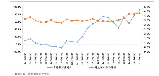 “二手房挂牌量创新高”成为许多城市地产圈的热点话题:在公开的中介平台上,10月,北京二手房挂牌量突破16.6万套、深圳接近6万套;11月,西安挂牌量突破19万套,12月又超过20万套……诸葛数据研究中心监测数据显示,2023年11月,其监测的14个重点城市二手房挂牌量同比大幅上涨96.18%,环比再涨2.18%,已呈现“五连升”。