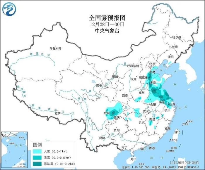 28日至30日的早晨至上午时段,天津中南部、河北东部、山东中西部、河南东部、安徽中北部、江苏大部、浙江北部、四川盆地东部、重庆西部等地部分地区有大雾,其中河北东部、山东西部、江苏中南部、安徽东北部、重庆西部局地有能见度不足200米的强浓雾。28日大雾主要影响山东东部和江苏;29日主要影响山东南部、安徽东部、江苏、浙江北部等地;30日主要影响天津南部、河北东部、山东西部、四川、重庆等地。