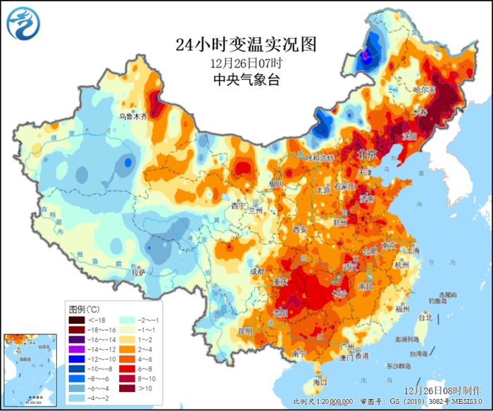 今天,“回暖”依然是天气主旋律。一大早,东北地区升温最猛,因为南风暖平流+夜间云层的保暖作用,稳住了夜间本该下降的气温,部分地区气温升幅超过10℃,吉林靖宇升幅最大,达到18.2℃。