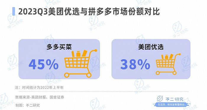 在美团优选业务中,尽管比多多买菜更早进入社区团购市场,但目前市场份额被后者反超。根据国金证券研究的数据显示,截至今年上半年,多多买菜的市场份额达到45%,而美团的市场份额为38%。