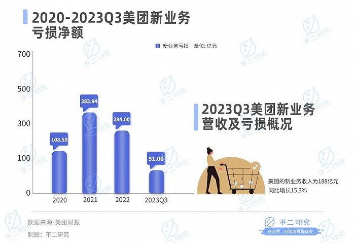 根据美团发布的三季报,2023年Q3美团的新业务收入为188亿元,同比增长15.3%;经营亏损为51亿元,同比收窄24.5%,经营亏损率为27.2%。