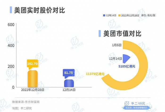 截止12月14日港股收盘,美团报收81.75港元/股,对应市值5105亿港元(约折合人民币4664亿元);对比2022年12月市值高点11375亿港元,其市值已经蒸发6270亿港元。