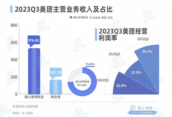 「不二研究」据美团三季报发现:今年三季度,美团的核心本地商业的经营利润率下滑至17.5%。目前,美团主要面临核心本地商业业务增收不增利、新业务增长乏力等问题,在「不二研究」看来,这主要是由于抖音等互联网巨头入局本地生活,导致美团不得不增加季节性补贴费用,高额营销费用使其净利润承压;与此同时,随着盒马、山姆等新老玩家入局,也给美团新业务业绩增长带来更多不确定性。