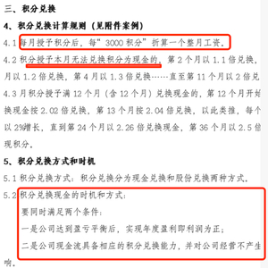 上游记者从《公司积分制度》看到:“创业团队或公司授予所有专职或兼职参与公司发展或帮助公司发展的公司员工,或外部协助人积分。全职参与公司事务,按日授予100积分。每月授予积分后,每‘3000积分’折算一个整月工资。积分授予本月无法兑换积分为现金的,第2个月以1.1倍兑换,第3个月以1.2倍兑换,第4月以1.3倍兑换……直至第11个月以2倍兑换。”积分兑换现金必须同时满足两个条件:“一是公司达到盈亏平衡后,实现年度盈利即利润为正;二是公司现金流具备相应的积分兑换能力,并对公司经营不产生重大影响。”