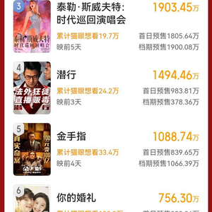 4亿多元的产出中,《一闪一闪亮星星》独扛超3亿票房,已经开启提前点映的《年会不能停!》目前将超过5000万票房收入囊中。元旦档中开启预售最晚的《泰勒·斯威夫特:时代巡回演唱会》预售后来居上,目前已超过刘德华的两部新片,位列元旦票房榜第三的位置。
