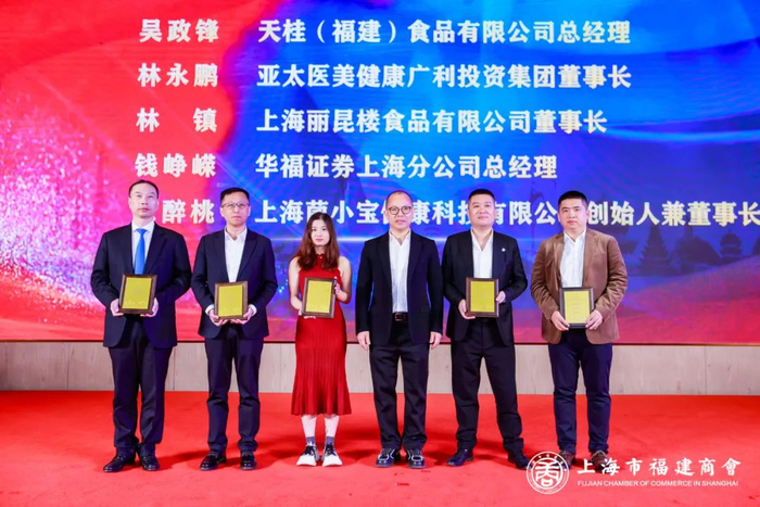上海市福建商会会长林腾蛟向新任副会长天桂(福建)食品有限公司总经理吴政锋、亚太医美健康广利投资集团董事长林永鹏、上海丽昆楼食品有限公司董事长林镇、华福证券上海分公司总经理钱峥嵘、上海菌小宝健康科技有限公司董事长涂醉桃颁牌。