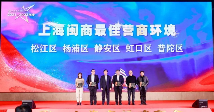上海市福建商会轮值会长郭加迪为松江区、杨浦区、静安区、虹口区、普陀区颁发上海闽商最佳营商环境荣誉牌匾。
