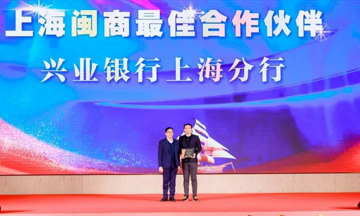 上海市福建商会名誉会长吕明向兴业银行上海分行颁发最佳事业合作伙伴奖。