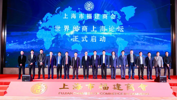 松江区委书记程向民,上海市福建商会会长林腾蛟,上海市福建商会监事长于晓青,商会名誉会长占万龙代表上海市福建商会与世界各地友好闽籍侨商社团共同发起世界闽商上海论坛计划。