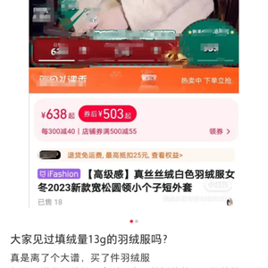 22日,一位深圳女网友发帖称自己被网购的羽绒服震惊了,“真是离了个大谱,买了件羽绒服,拿到手上一摸挺薄的,压根就摸不到绒,一看填绒量13g,真的是服了,13g的充绒量能算是羽绒服吗?虽说是薄款羽绒服,但是13g也太薄了吧?也不知道大家见过13g充绒量的羽绒服没有,反正我是没见过。”