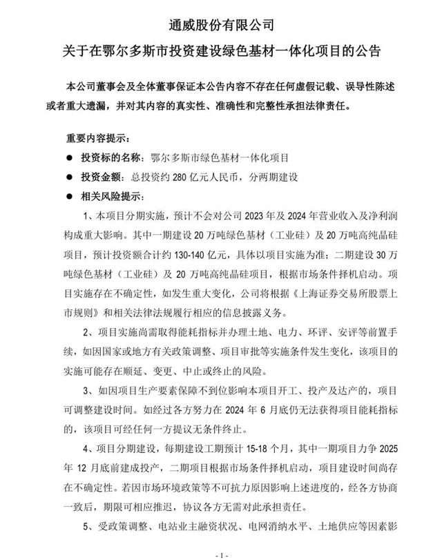 12月25日晚,通威股份发布公告称,公司拟与鄂尔多斯市人民政府、准格尔旗人民政府共同签署《绿色基材一体化项目投资协议书》,就公司在鄂尔多斯市准格尔旗准格尔经济开发区投资280亿元,建设绿色基材一体化项目达成合作。