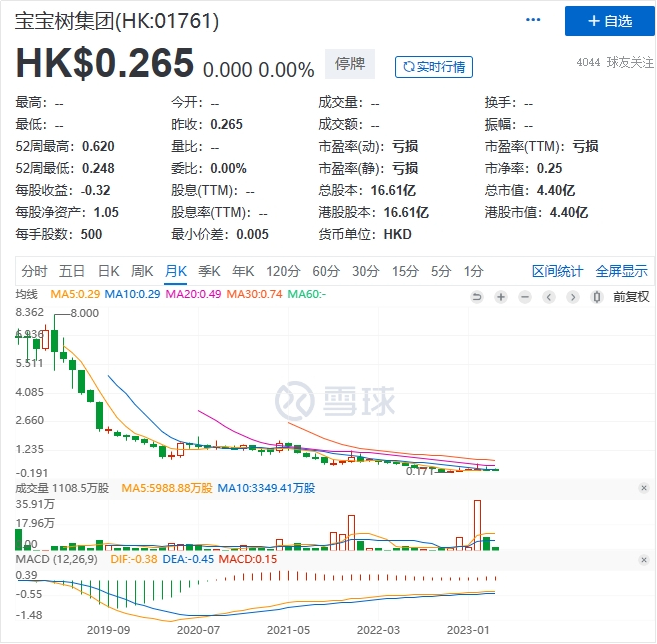 从今年5月初开始,宝宝树已停牌超过8个月了。截至停牌前,宝宝树股价为0.265港元,公司市值为4.4亿港元,较其巅峰市值134亿港元,已跌超96%。