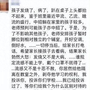 结果家长勃然大怒,说“发烧又不是大病,谁规定流感不能上学,戴个口罩不就得了……流感又不是十恶不赦,你居然给他隔离在教室外,剥夺他学习的权利,我投诉你,投诉你们学校……”