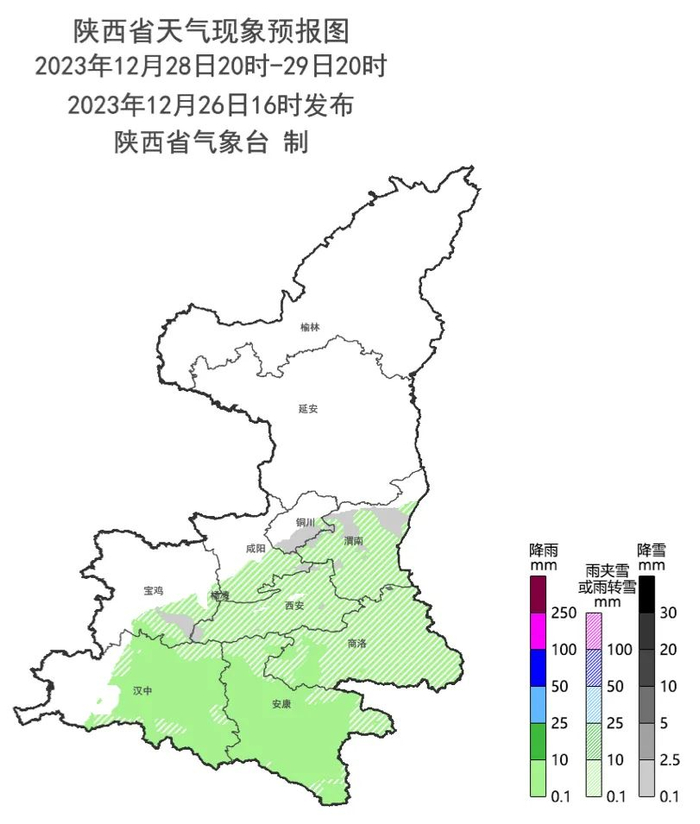 12月28日20时-12月29日20时:陕北、关中西部阴天转多云,关中东部、陕南阴天。关中部分地方有小雪或雨夹雪,陕南大部有小雨或雨夹雪。陕北西部有4级左右西北风。