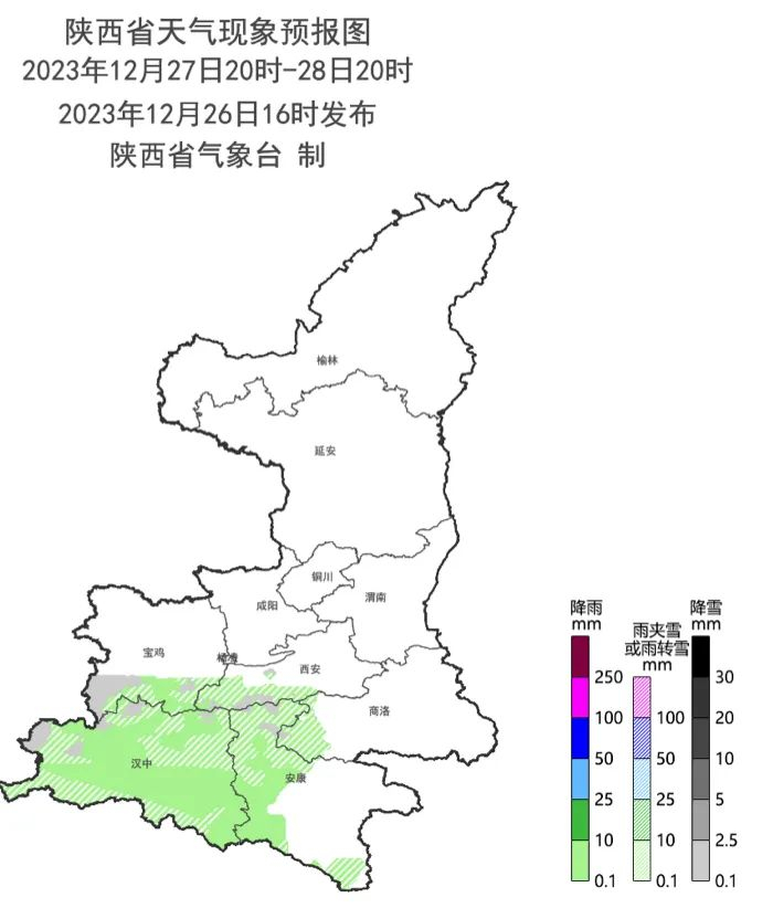 12月27日20时-12月28日20时:陕北北部、关中东部多云,陕北南部、关中西部、陕南多云转阴天,秦岭山区西段部分地方有小雪或雨夹雪,陕南中西部部分有小雨或雨夹雪。
