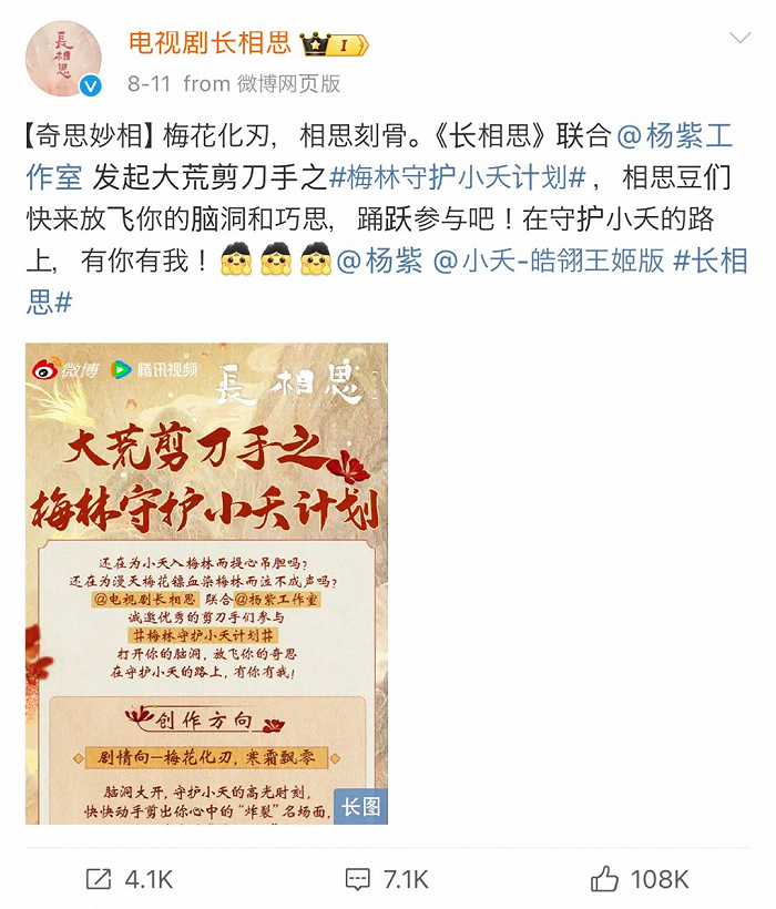 例如,暑期档爆款剧《长相思》在剧集争议后,剧方携手艺人工作室官微联合发起 #梅林守护小夭二创大赛# 话题发布分轨文件,点燃微博网友二创热情,成功引来了很多网友主动投稿,带动剧集口碑扭转、讨论度回升,助力剧集持续破圈。下半年播出的《云之羽》《宁安如梦》等热播剧里,观众的讨论、二创也已成为制造热门话题的标准路径。