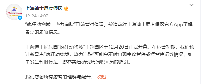12月24日事发至今,上海迪士尼方面未就“女童跳车”事件发表任何公开回应,仅在事发当日两度发布了“疯狂动物城:热力追踪”暂时停运的消息。