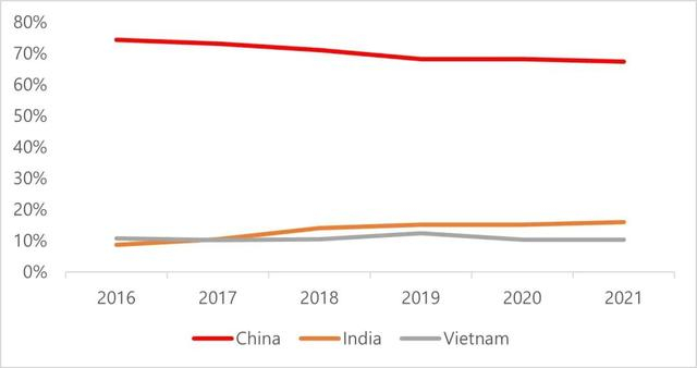 以手机行业为例,它是目前最深入、系统参与全球分工的细分电子产业,中国曾经是全球手机工厂,但情况正在发生变化。