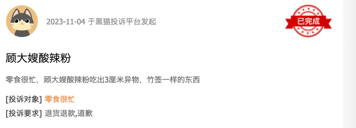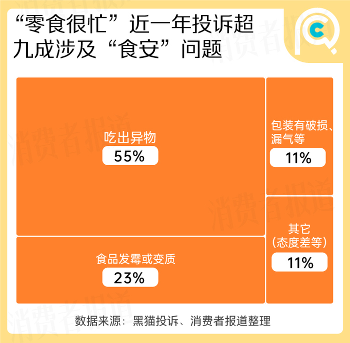 今年,零食很忙仅在黑猫投诉平台就达到97起,超九成投诉直指“食安”问题。其中55%的投诉指出在零食里吃出异物,23%的投诉表示购买的零食发霉变质。