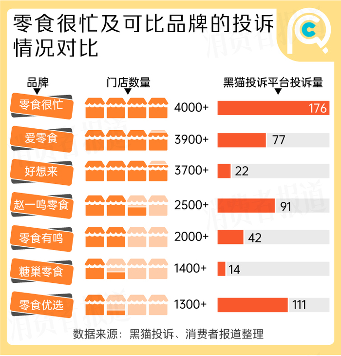 截至今年8月,连锁门店数量超过千家的量贩零食品牌,除了零食很忙之外还有零食优选、爱零食、赵一鸣零食、零食有鸣、好想来、糖巢零食等。据不完全统计,在这些同类型且规模相当的量贩式零食品牌中,零食很忙的投诉量也较为突出。