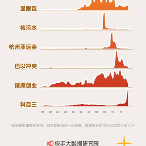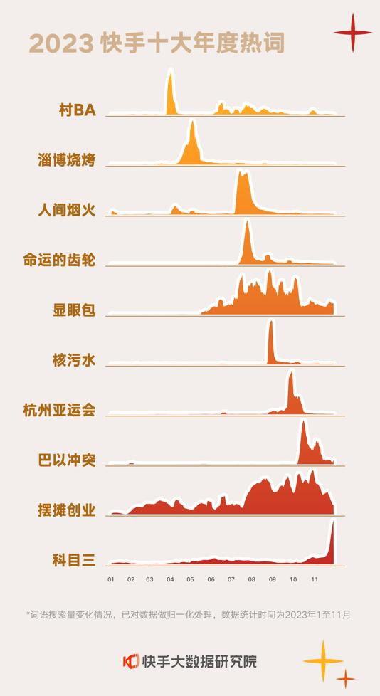 12月26日,快手大数据研究院发布2023快手十大年度热词:村BA、淄博烧烤、人间烟火、命运的齿轮、显眼包、核污水、杭州亚运会、巴以冲突、摆摊创业、科目三,从短视频平台的视角,回顾了过去一年的十个关键词,客观上标记了整个社会的关注焦点和心绪流变。据悉,年度热词基于快手平台搜索和热点指数综合排名后产生。