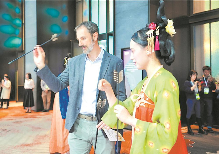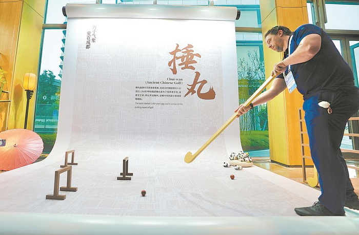 10月底成都世运会第一次竞赛经理会议上,与会嘉宾体验捶丸、投壶等中国古代体育运动