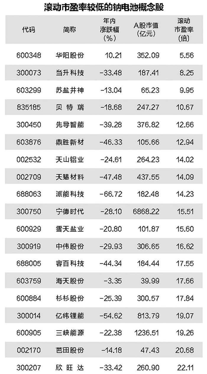 在大幅度调整之后,钠电池概念股估值水平进一步下移。目前滚动市盈率低于20倍的有17只,其中华阳股份、当升科技、苏盐井神市盈率不到10倍。