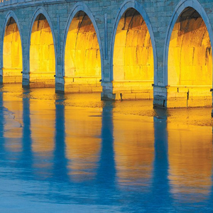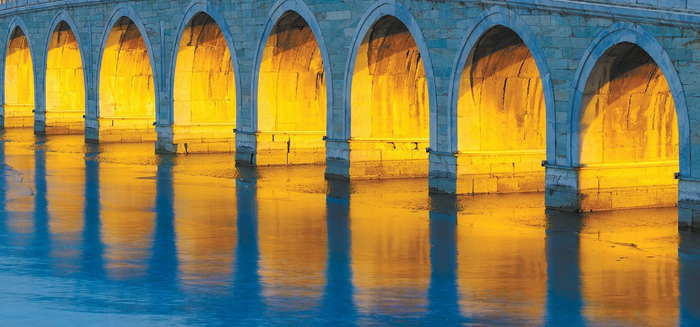 颐和园十七孔桥的“金光穿洞”原理则与这两处略有不同。每年冬至前后几天的下午,金黄色的落日光辉自西南方向射向东北方,通过静止的河面形成的强反射,穿过颐和园十七孔桥,将东侧洞壁全部照亮,呈现出格外壮丽的“金光穿洞”。形成这个奇观,除了时间因素,桥的方位和质量也很重要。十七孔桥并非完全东西向,而是东端略偏南、西端略偏北,方位角接近112度,而冬至北京日落的方位角为240度,经计算,这能使十七孔桥的多数桥孔均被全孔照射到,即使最小的桥孔也因光线的折反射和水面映射而显得光线充足。另外,十七孔桥的桥孔虽有大有小但都比较高大,且桥墩比较窄,很有韵律感,桥券石板尺寸均大而光整,具有比较高的反射率,为“金光穿洞”提供了有利条件,也凸显出十七孔桥的科学与精细。