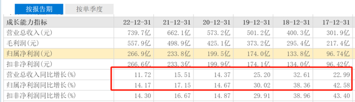 据连续多年财报显示,在净利润方面,五粮液表现同样呈下滑趋势,2022年归母净利润为266.6亿元,同比增幅为14.17%,而2021年的净利润增幅为17.15%,增幅下滑了近3个百分点。此前2017年至2019年,净利润增幅分别为42.58%、38.36%和30.02%,连续三年增幅超过30%,而近三年增幅最高的就是2021年的17.15%,其他两年增幅均为14%左右,甚至不及2017年至2019年中增幅最低年份的一半。