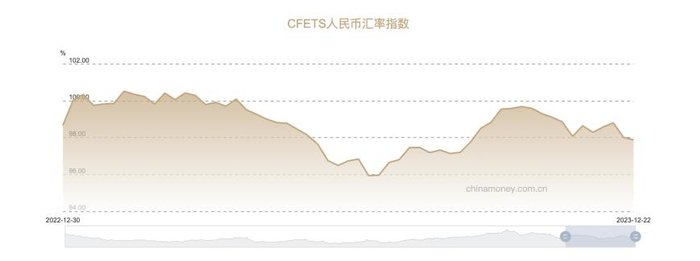 实际上,从代表一篮子货币汇率的CFETS人民币汇率指数来看,今年以来人民币币值下降幅度较为缓和。根据中国货币网数据显示,2023年12月22日,CFETS人民币汇率指数为97.88,而2022年12月30日的指数为98.67。