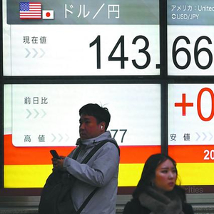 图片说明: 12月19日在东京,路人经过显示“1美元兑换143.66-67日元”汇率的电子屏幕。 (法新社)